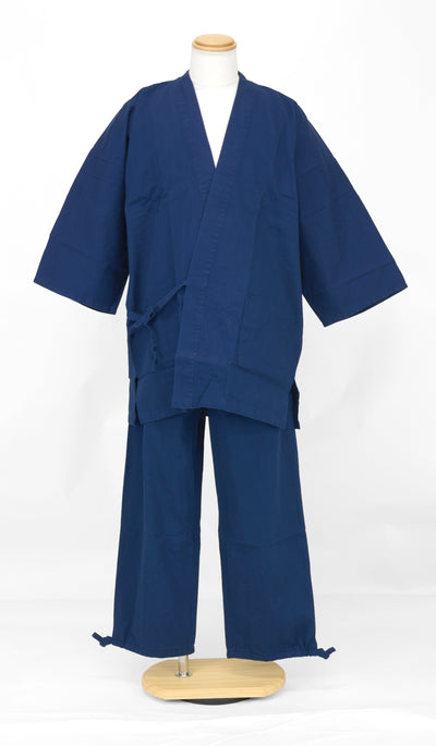 デニム調の風合いがカジュアルさを演出し、現代的で親しみやすい作務衣に仕上がっています。