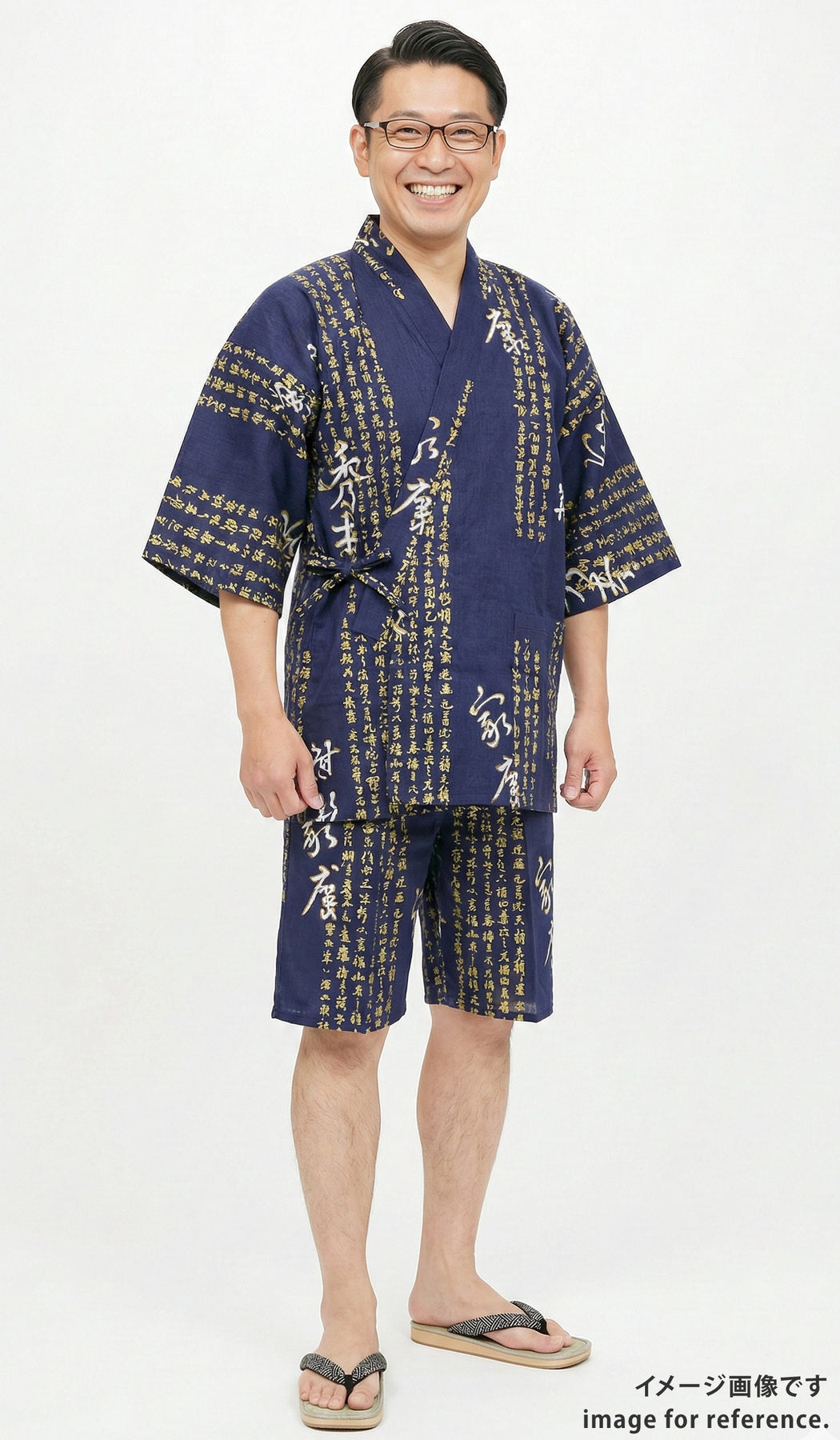 夏のお出かけ、部屋着にぴったりな甚平です。軽い外出やリラックスシーンでも、心地よく快適にお過ごしいただけます。秀吉とお経がプリントされている一着。
