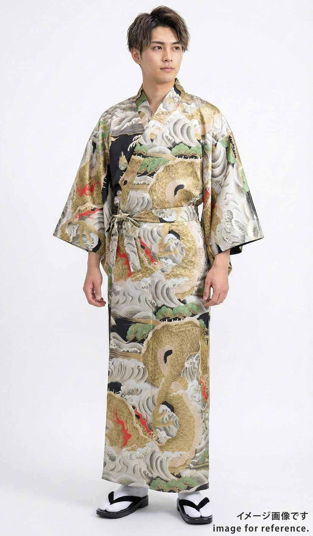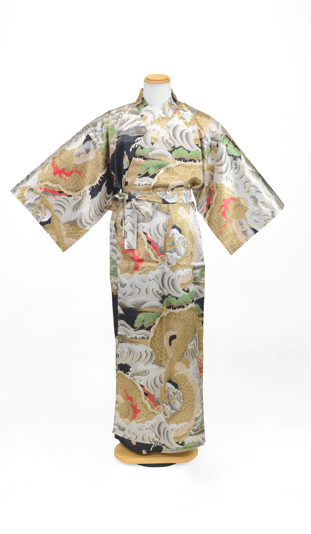 シルク素材でできた男性着物です。光沢感があり、なめらかな着心地です。やわらかな肌触りにゴージャスなデザイン、当店でも自慢の一品です。龍と松の柄が大人の男の貫禄をいっそう引き立てます。
