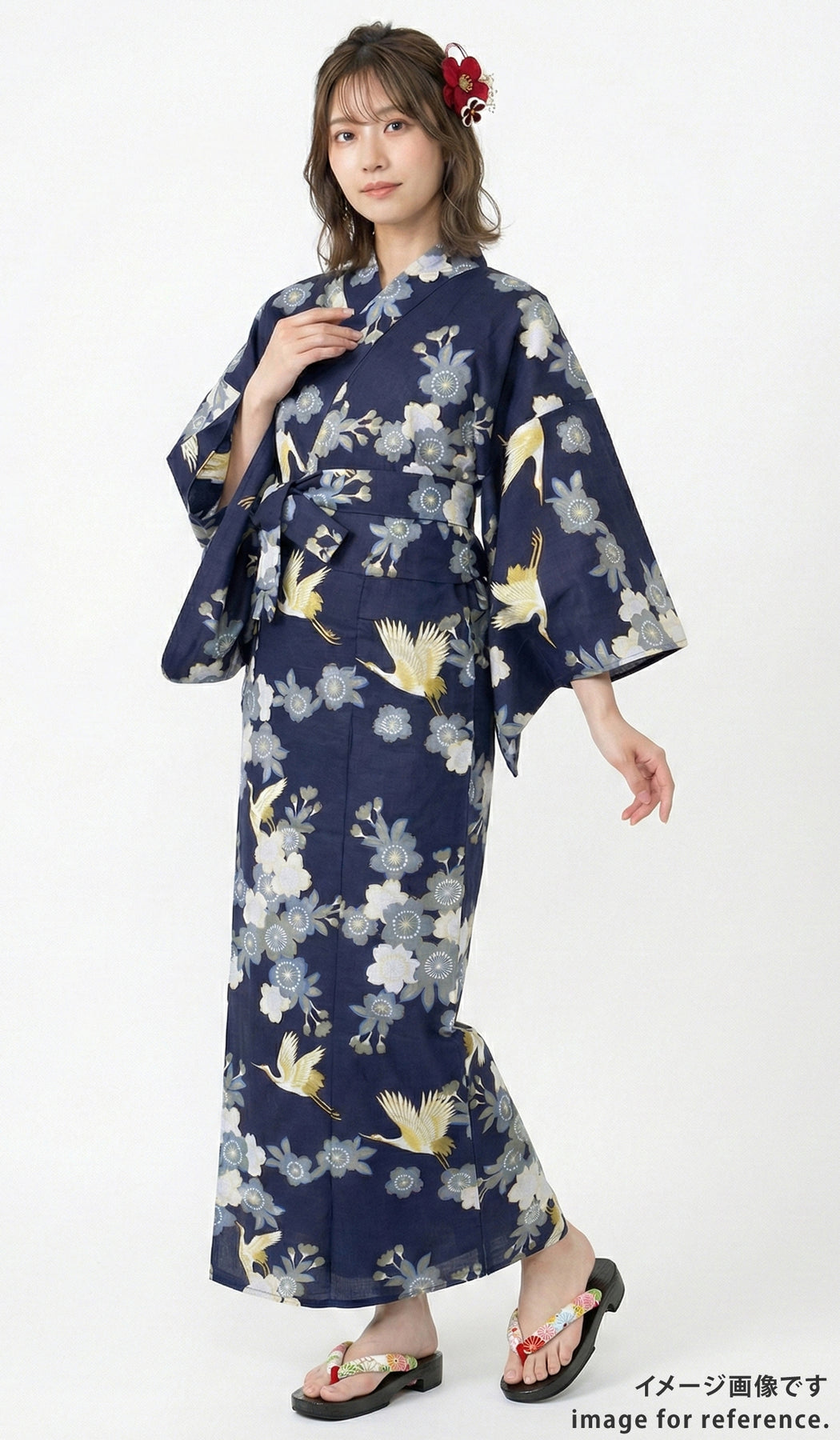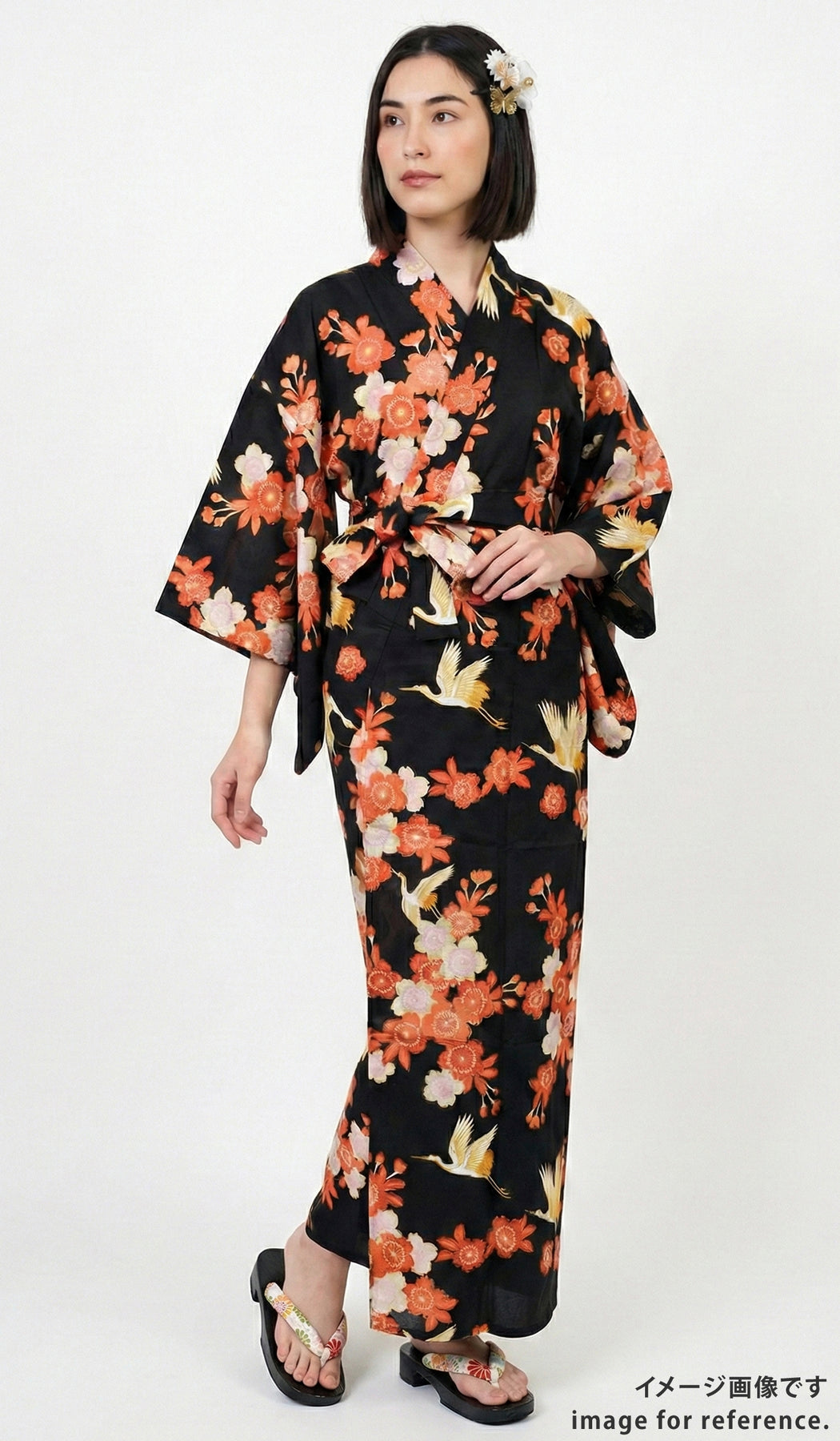 儚くも美しい桜と長寿の象徴である鶴の調和が素晴らしい一着。
