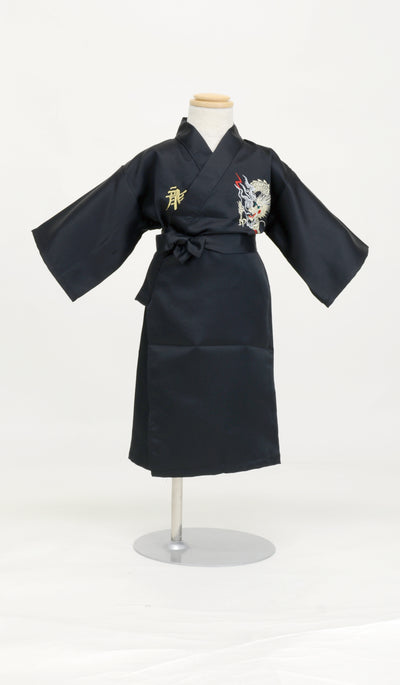 This children's kimono features a powerful depiction of two dragons flying high in the sky.