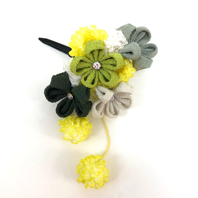 A cute clip-type hair ornament with flowers made from shibori fabric.