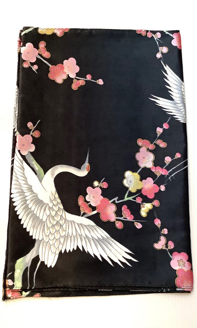 This silk scarf features plum blossoms, which evoke the arrival of spring, and cranes, which are symbols of longevity and marital harmony.