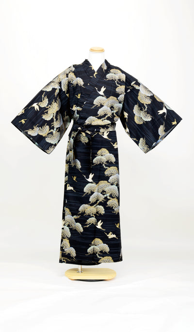 This outfit features a design of pine trees and cranes.
