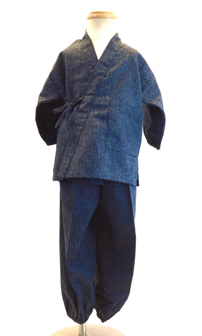 A calm, modern Japanese kimono-style workwear for children with a kasuri pattern.