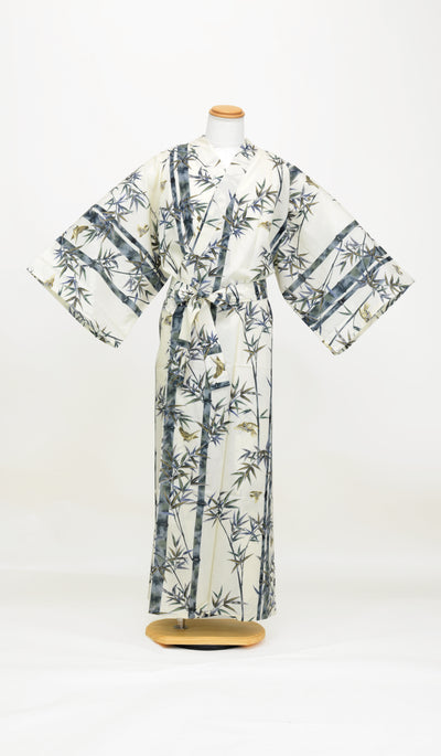 The garment features designs of bamboo and sparrows, giving the wearer the impression of wearing a Japanese painting.