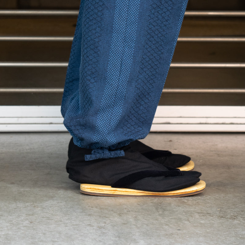 裾ひも付きで足元の調整もしやすく、上着は筒袖&脇スリットで作業や家事の邪魔になりません。